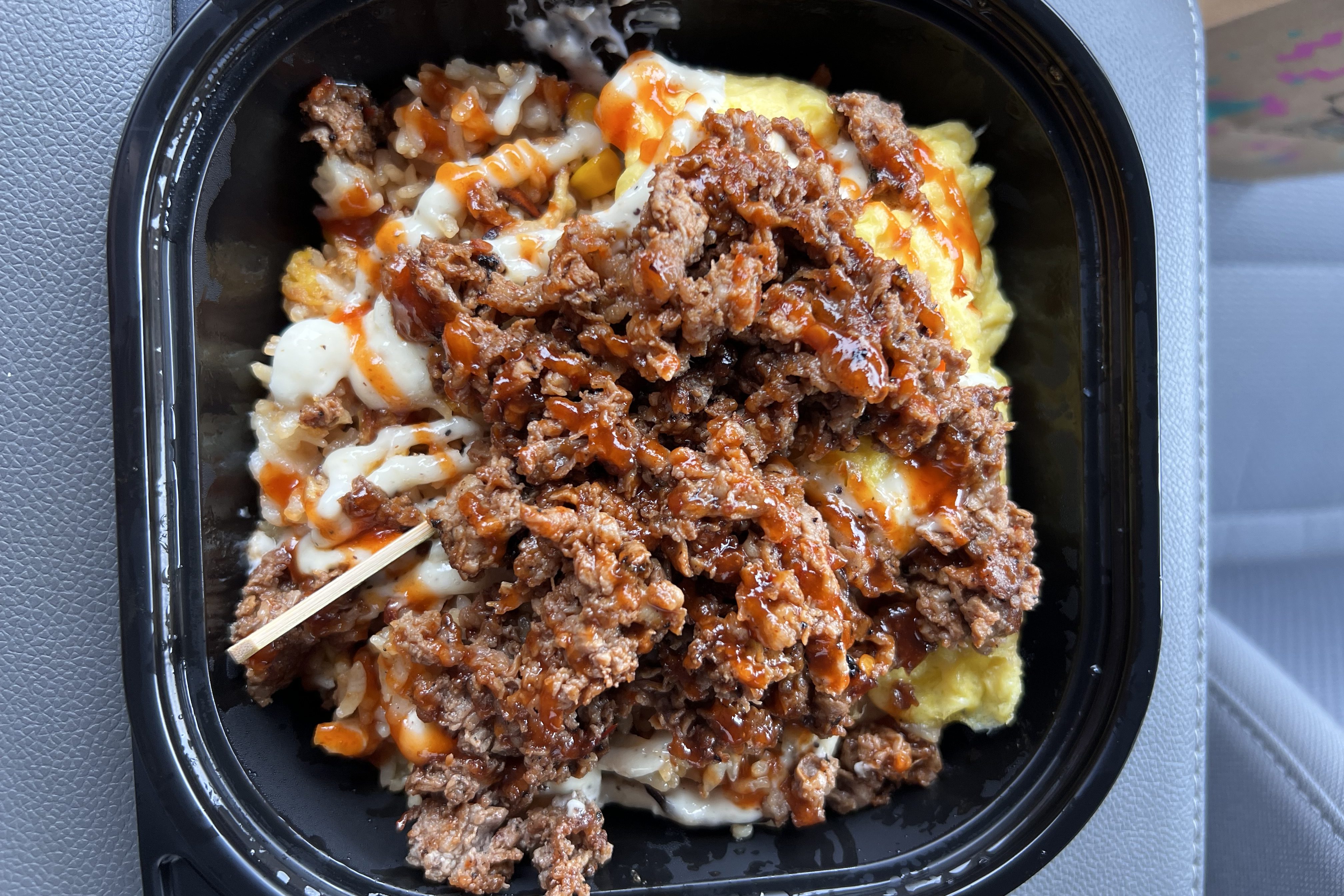 If you’re in the mood for something savory and a little different, this bowl is where it’s at. It starts with a base of flavorful fried rice loaded with fire-roasted poblano corn, carrots, and egg. Then comes the star of the dish—tender, marinated bulgogi shaved steak that’s packed with bold, savory flavor. The Everything Bagel aioli adds a creamy tang, while the pickled onion slaw brings a bright acidity that balances out the richness. To finish it off, there’s a drizzle of spicy sriracha glaze, a sprinkle of Everything Bagel seasoning for that garlicky crunch, and fresh cilantro for a pop of brightness. This dish is packed with layers of flavor and is one of my top lunch choices.